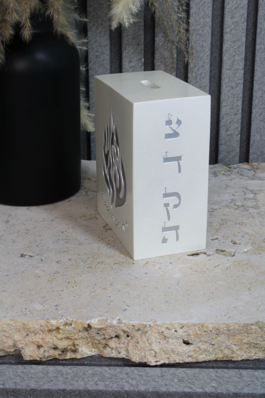 קופת צדקה האש שלי צבעי לבן וכיתוב כסף.
